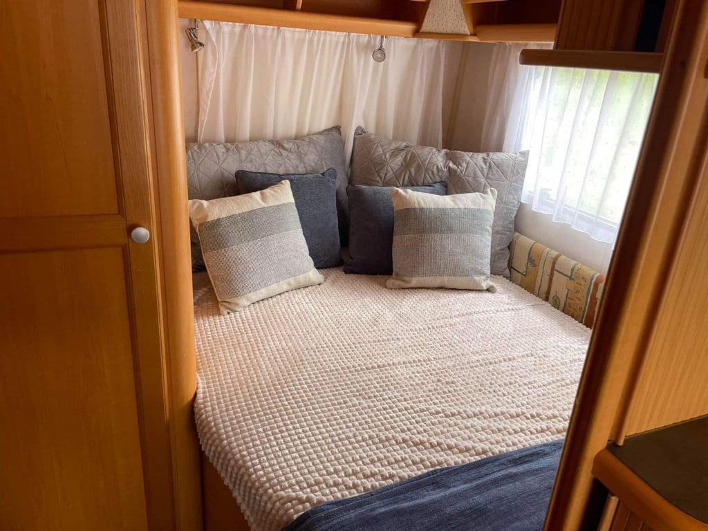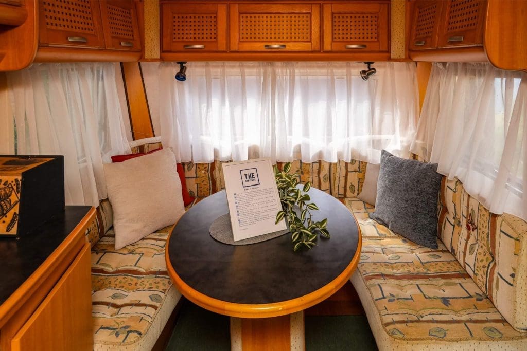 Comfortable caravan with double bed and a convertible dining area for additional sleeping space. Gas-powered stovetop and kettle in the caravan’s interior kitchenette