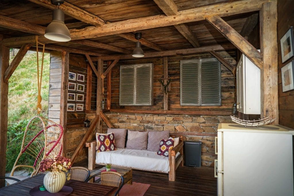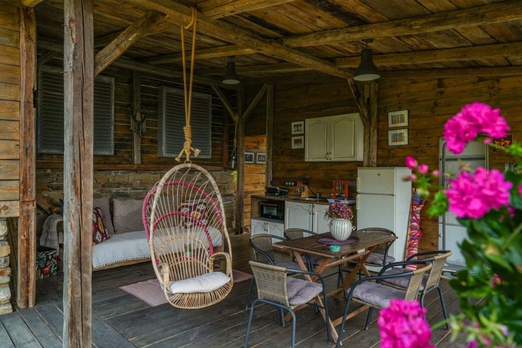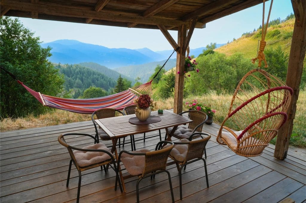 Large, covered deck with a dining table, sofa, hanging rattan chair, and hammock