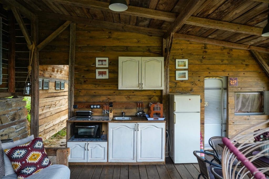 Fully equipped outdoor kitchen: sink, oven, high-quality grill, coffee machine, fridge, and all essential utensils